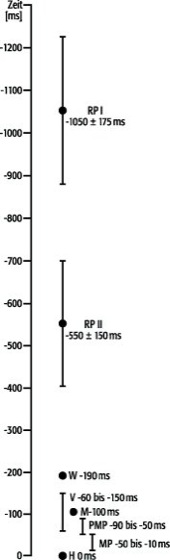 RP I Bereitschaftspotential einer geplanten Handlung, RP II Bereitschaftspotential einer spontanen Fingerbewegung, W Absicht (Bewußtwerdung des Bewegungswillens), V "Vetozeitraum", M Bewußtwerdung der Bewegungsausführung, PMP premotion positivity (Auslösepotential?), MP Motorpotential zum Muskel, H Handlungsbeginn (Muskelaktivität im EMG).