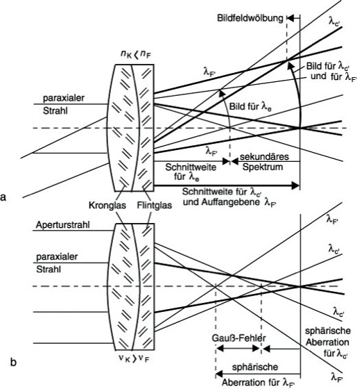 Achromat: Restaberrationen eines Altachromaten für dünne (a) und Aperturstrahlenbündel (b). nK, nF Brechzahlen; νK, νF Abbesche Zahlen; λe=546 nm, λF'=480 nm, λC'=644 nm.