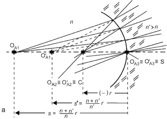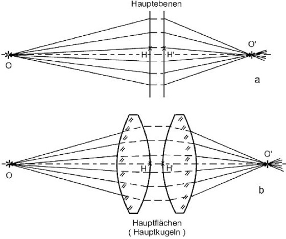 oder 0 möglich, wobei n und n' die beiden Brechzahlen und r den Radius der Kugelfläche bezeichnen (Abb. 1). Sie erfordert – im Gegensatz zur Gaußschen Abbildung – zu den konjugierten, aplanatisch korrigierten Punkten konzentrische Hauptflächen (Abb. 2). Dadurch bleibt die a. A. außeraxialer Punkte nicht aberrationsfrei.