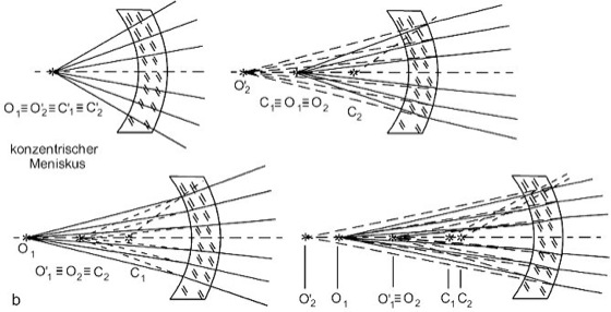 Aplanatische Abbildung 1: Aplanatische Punkte einer brechenden Fläche (a) und aplanatischer Menisken (b).