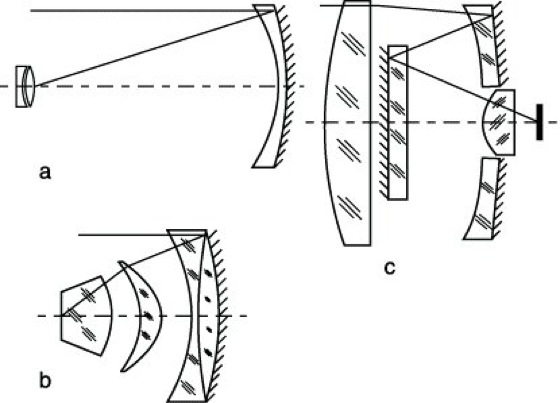 Aplanatische Spiegelsysteme 1: a) Linsenkorrektionssystem nach Ross, b) Korrektionssystem nach Baker, c) Zweispiegelkorrektionssystem nach Picht, d) Zweispiegelsystem nach Schwarzschild, e) Zweispiegelsystem nach Chretién.