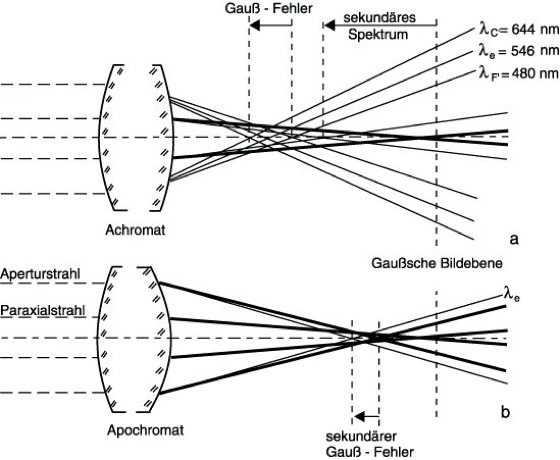 Apochromasie, aplanatische Korrektion des sekundären Spektrums und des Gauß-Fehlers (chromatische Aberration) optischer Systeme (Abb.) durch Einsatz von optischen Medien anomaler Teildispersion und von Glaspaaren, deren Abbesche Zahlen νi sich wie ihre Brechzahlen verhalten (Lanthankrone und Tiefflinte). Entsprechend apochromatisch korrigierte optische Systeme heißen Apochromate. Bei A. ist außer der Achromasiebedingung (Achromasie) auch die Apochromasiebedingung