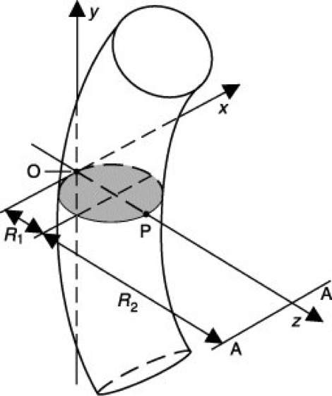 Einfache Beispiele für a. F., die in bezug auf die optische Achse nicht rotationssymmetrisch sind oder liegen, sind torische Flächen und Zylinderflächen. Eine torische Fläche (Abb. 3) entsteht durch Rotation eines Kreises um eine Achse AA, die in der Ebene des Kreises liegt, aber nicht durch seinen Mittelpunkt geht. Optisch genutzt wird nur ein Teil einer solchen Fläche, z.B. für eine Linsenfläche die Umgebung des Koordinatenursprungs O. Wenn der Radius R1 des erwähnten Kreises kleiner als der Rotationsradius R2 ist, spricht man von einer wurstförmigen, bei R1>R2 von einer tonnenförmigen torischen Fläche. Die beiden Hauptkrümmungen in Abb. 3 haben in O gleiches und in P verschiedenes Vorzeichen (Sattelpunkt). Im Grenzfall R2→∞ entsteht eine Zylinderfläche.