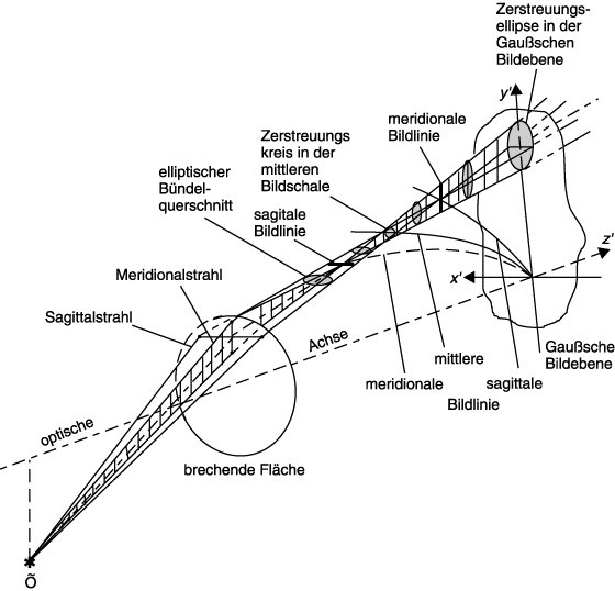 Der auch als Zweischalenfehler bezeichnete A. schiefer Bündel entsteht analog zum axialen A. torischer Flächen dadurch, daß für flächenorthogonal einfallende Strahlenbündel eine Kugelfläche im Sagittalschnitt (sagittal) eine gegenüber dem Meridionalschnitt (meridional) veränderte effektive Krümmung besitzt. Dadurch verlieren die schiefen Strahlenbündel ihre Rotationssymmetrie, so daß sich die Meridionalstrahlen in einer sagittalen Bildlinie und die Sagittalstrahlen in einer meridionalen Bildlinie schneiden, die beide im allgemeinen gegenüber der Bildebene der Gaußschen Abbildung um b ![]()