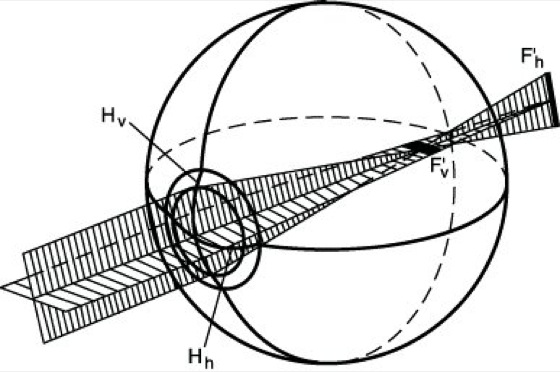 Die Berechnung des A. schiefer Bündel erfolgt mit den Gullstrandschen Abbildungsgleichungen für dünne meridionale und sagittale Strahlenbündel: ![]()