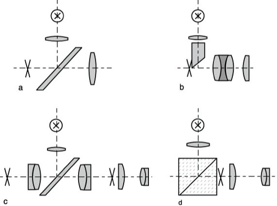 Beim A. nach Schönrock (Abb. c) werden durch zwei Objektive die beleuchtete Marke und ihr Bild an dem Orte des Fadenkreuzes im Okular abgebildet. Die zur Beleuchtung erforderliche teildurchlässige Platte steht zwischen den beiden Objektiven im parallelen Strahlengang. Das Schönrocksche A. ist speziell für den Fall hoher Okularvergrößerungen geeignet.