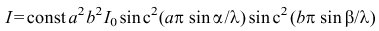 2) Beugung am Rechteck. Die Intensitätsverteilung für die Fraunhofersche B. an einer Rechtecköffnung der Abmessung a·b ergibt sich aus der entsprechenden Formel der Beugungstheorie durch einfache Integration zu![]()