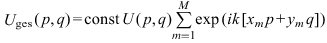 6) B. an statistisch verteilten Objekten. Die B. an unregelmäßig verteilten gleich großen Öffnungen oder Teilchen (M. v. Laue 1914) ergeben sich durch Summation der Amplitudenverteilungen für die M einzelnen Öffnungen oder Teilchen. Es sei U(p, q) die Amplitudenverteilung für Fraunhofersche Beugung (Beugungstheorie) an einer Einzelöffnung bzw. einem einzelnen Teilchen im Falle senkrecht zum Schirm einfallenden Lichtes mit p und q als Richtungscosinus bezüglich der zur Ausbreitungsrichtung z senkrechten x- und y-Achse. Die gesamte Lichterregung ist dann gegeben durch![]()