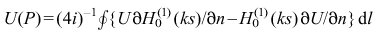 (Helmholtz-Kirchhoffsche Formel) mit s als Abstand des Flächenelementes df von P (Abb. 1). Die Funktion G=exp(iks)/s ist die Greensche Funktion der Helmholtzschen Differentialgleichung (2) im freien Raum. Sie stellt eine divergierende Kugelwelle dar. Für zweidimensionale Probleme gilt die zu (3) analoge Darstellung![]()