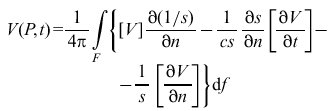(Kirchhoff 1883) für die zeitabhängige Erregung V (ohne Separation der hochfrequenten Zeitabhängigkeit) zu verwenden, wobei c die Lichtgeschwindigkeit bezeichnet. Die eckige Klammer bedeutet, daß die Zeit in der betreffenden Funktion durch das retardierte Argument t-s/c zu ersetzen ist. Es ist bemerkenswert, daß sich eine solche allgemeine Formulierung des Huygensschen Prinzips nur für Räume mit ungeradzahliger Dimension, nicht jedoch für solche geradzahliger Dimension angeben läßt. In letzterem Falle wird nämlich die Erregung V(P, t) nicht nur durch die zur jeweiligen retardierten Zeit vorliegenden Werte von V, ∂V/∂t sowie ∂V/∂n auf einer geschlossenen Fläche (im physikalisch interessanten zweidimensionalen Falle einer geschlossenen Kurve) bestimmt, sondern außerdem durch die Werte der genannten Größen zu grundsätzlich allen früheren Zeitpunkten (V. Volterra 1912).