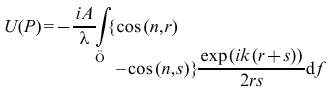 Bei der Anwendung von (3), (4) oder (5) auf das Problem der Beugung an einer Öffnung in einem undurchsichtigen Schirme wird die Fläche F so gewählt, daß sie durch die Öffnung geht und den Schirm enthält. Sie wird durch den Teil einer Kugelfläche (mit P als Kugelmittelpunkt) geschlossen, der in dem der Lichtquelle abgewandten Raumbereiche liegt. Letzteres Flächenstück liefert bei großer Ausdehnung des Schirmes wegen seiner großen Entfernung von P keinen Beitrag zur Erregung in P. Für eine exakte Auswertung der o.g. Beugungsformeln benötigt man jedoch die genaue Kenntnis von U und ∂U/∂n in der beugenden Öffnung und auf dem Schirme. Da diese fehlt, ist man auf Näherungsannahmen angewiesen. Kirchhoff machte die naheliegende (wenn auch mathematisch widersprüchliche) Annahme, daß die genannten Größen auf dem Schirme verschwinden und in der Öffnung genau so groß sind wie bei fehlendem Schirme. Somit ist die Integration in den Beugungsformeln nur über die beugende Öffnung zu erstrecken. Die Kirchhoffsche Annahme ist um so besser gerechtfertigt, je kleiner die Wellenlänge im Vergleich zu den Dimensionen der Öffnung ist. Sobald die Wellenlänge die Größenordnung der Ausdehnung der Öffnung erreicht, wird sie jedoch problematisch. Dieser Fall tritt jedoch in der Optik zumeist nicht auf. Tatsächlich befindet sich die Kirchhoffsche Theorie in sehr vielen Fällen in ausgezeichneter Übereinstimmung mit dem Experiment. Unter Voraussetzung einer punktförmigen Lichtquelle kann aus (3) mit den Kirchhoffschen Annahmen die Fresnel-Kirchhoffsche Beugungsformel