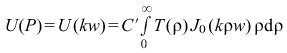 mit p=x/s'+x0/r'=l-l0 und q=y/s'+y0/r'=m-m0, wobei l, m die Richtungskosinus des gebeugten Strahles O→P gegen die ξ- und η-Achse, l0, m0 die entsprechenden Richtungskosinus des einfallenden Strahles P0→O und C eine komplexe Konstante bedeuten. Setzt man die Funktion T(ξ,η) durch die Maßgabe T(ξ, η)=0 für die Punkte außerhalb der Öffnung in die ξ-η-Ebene fort, so ist U(kp, kq) die Fourier-Transformierte von T(ξ, η) und umgekehrt. Liegt Rotationssymmetrie vor und gilt T(ξ, η)=T(ρ) mit ρ2=ξ2+η2, so kann die Winkelintegration in (7) ausgeführt werden. Das Ergebnis lautet