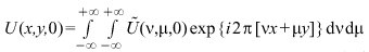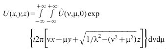 4) Rayleigh-Sommerfeld-Debyesche B. Diese geht statt von Kugelwellen von ebenen Wellen als den zu überlagernden Elementarlösungen der Wellengleichung aus: Wenn man aus der Feldverteilung U(x, y, 0) in der Ebene des Beugungsschirmes (Quellebene) die Feldverteilung U(x, y, z) in der im Abstande z vom Schirm befindlichen Beobachtungsebene berechnen will, so stelle man die Verteilung U(x, y, 0) als Fourier-Integral![]()
