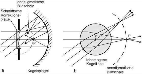 für die anastigmatische Bildfeldebnung, die zusammen mit der Achromasiebedingung (Achromasie) nur durch Glaspaare erfüllt werden kann, deren Abbesche Zahlen sich wie ihre Brechzahlen verhalten, d.h. durch Kombination von Sammellinsen aus hochbrechendem (Lanthan-)Kronglas und Zerstreuungslinsen aus niedrig brechendem (Tief-)Flintglas (Anastigmat). Alle kugelsymmetrischen Systeme wie einzelne Kugelflächen, Kugellinsen und das Maxwellsche Fischauge haben B. (Abb.).