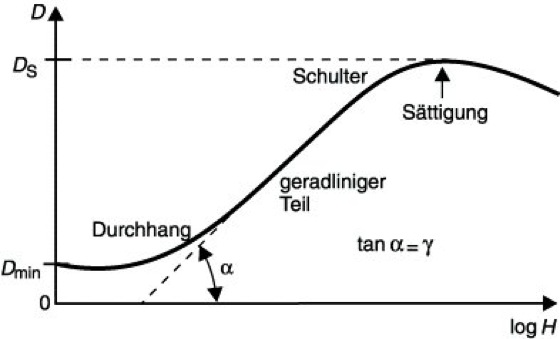 Der c. K. lassen sich folgende wichtige Angaben über ein Negativ-Photomaterial entnehmen: Die minimale Dichte entspricht der des verarbeiteten Photomaterials, ohne daß eine Belichtung erfolgt ist. Die Dichte, die sich nach Abzug der Dichte der Unterlage der photographischen Schicht von der minimalen Dichte ergibt, wird durch den photographischen Schleier verursacht. Der sich anschließende gekrümmte Teil der c. K. heißt Durchhang; er charakterisiert das Gebiet der Unterbelichtung. Für die Praxis sehr wichtig ist der fast lineare Teil der c. K.; im Normalfall sollten Belichtungen in diesem Bereich erfolgen. Bei hohen Dichten krümmt sich die c. K. erneut (Schulter); es ist das Gebiet der Überbelichtung. Schließlich wird die maximale optische Dichte (Sättigungsdichte DS) erreicht. Bei noch größerer Belichtung nimmt bei manchen Photomaterialien die Dichte wieder ab; es ist der Bereich der Solarisation (photographische Effekte). Von der Größe der Sättigungsdichte hängt der Helligkeitsumfang ab, der von einem Photomaterial wiedergegeben werden kann. Bei Photopapier beträgt er etwa 1:30 (DS≈1,5), bei Positivfilmen etwa 1:100 (DS=2,0). Die Steilheit (Gradation) der c. K. in einem bestimmten Intervall der Belichtung wird durch den Gradienten g angegeben. Wird das Belichtungsintervall auf den geradlinigen Teil der c. K. beschränkt, so erhält man den maximalen Gradienten gmax; er wird als Gamma-Wert (γ) bezeichnet:![]()