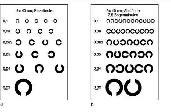 Crowding: a) Einzeloptotypen, b) Optotypen mit einem Abstand von 2,6 Bogenminuten. Aufgrund von Konturinteraktionen kommt es zu Trennungsschwierigkeiten bei den Optotypen. d Prüfentfernung; die Zahlen geben die Sehschärfe an.