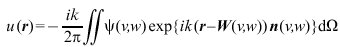 Debye-Picht-Luneburg-Formeln für konvergierende Wellenfronten. Im Rahmen der Formulierung der Beugungstheorie mit Hilfe von Überlagerungen ebener Wellen kann die Fokussierung aberrationsfreier wie auch aberrationsbehafteter konvergierender Wellenfronten für Abbildungszwecke behandelt werden. Die allgemeine Superposition monochromatischer ebener Wellen unterschiedlicher, durch einen Einheitsvektor e gekennzeichneter Ausbreitungsrichtung mit einer Gewichtsfunktion ϕ(v, w)![]()