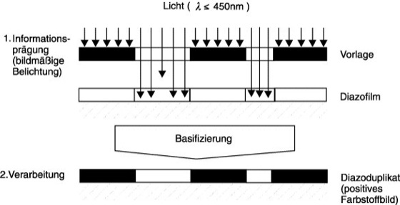 Diazoverfahren, zusammenfassender Terminus für reprographische Verfahren, die im Informationsprägungsschritt die Lichtempfindlichkeit von "Diazo"verbindungen nutzen.