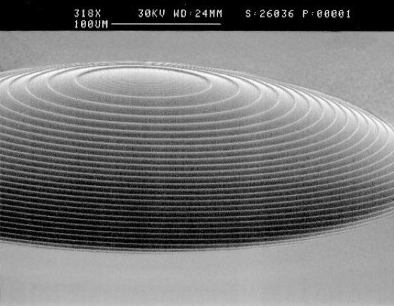 Diffraktives optisches Element 1: Aufteilung eines Laserstrahles durch ein dispersives optisches Element (DOE) in 16 Teilstrahlen, die auf einem Kreiskegel liegen, sowie Detail des mit einem Elektronenstrahl geschriebenen DOE (nach H.-J. Rostalski und H. Schwarzer, Berlin).