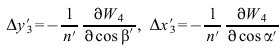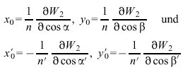 Besonders vorteilhaft ist es, die Richtungskosinus entsprechend cosα=(x-xB)/p, cosβ=(y-yB)/p, cosα'=(x'-x'B)/p' und cosβ'=(y'-y'B)/p' zugunsten der Koordinaten der konjugierten Punkte O und O' und der Strahldurchstoßpunkte B(xB, yB, zB) und B'(x ![]()