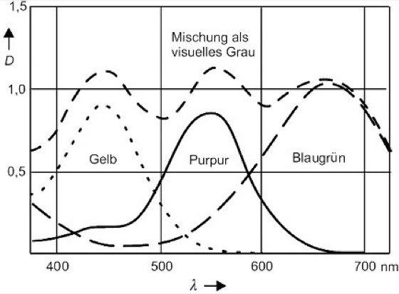 Colornegativ-Materialien liefern nach Belichtung und Verarbeitung ein Farbnegativ mit gelben, purpurnen und blaugrünen Teilbildern. Die Sensibilisierung ist überlappend (ähnlich wie in Abb. 1). Die Bildfarbstoffe sind so gewählt, daß ihre spektralen Absorptionsmaxima genügend weit auseinanderliegen. Alle modernen Colornegativ-Materialien sind wirksam maskiert. Das Farbnegativ dient als Vorlage für den Kopierprozeß auf ein Colorpositiv-Material, das die klassische oder auch eine vertauschte Schichtfolge besitzen kann. In der Stehbildphotographie wird von Farbnegativen auf Colorpapier kopiert (Printen). Die abermalige Colorverarbeitung liefert ein Positiv.