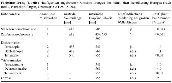 Angeborene Rot-Grün-Störungen lassen sich in Protan- und Deutanstörungen differenzieren. Bei Protanstörungen ist das Spektrum am langwelligen Ende verkürzt, während die Ausdehnung des wahrnehmbaren Spektrums durch Deutanstörungen nicht beeinflußt wird. Das Maximum der photopischen Hellempfindlichkeit ist bei Protanstörungen von 555 nm zu 540 nm hin verschoben. Das entsprechende Maximum ist bei Deutanstörungen fast unverändert.