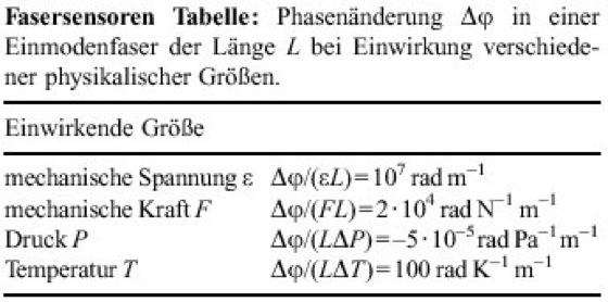 Eine direkte Beeinflussung der optischen Weglänge in der Signalfaser erfolgt durch eine mechanische Spannung, durch eine mechanische Kraft, durch Änderung des Druckes oder der Temperatur. Typische Werte für die dabei auftretende Phasenänderung sind der Tab. zu entnehmen. Faseroptische Interferometer eignen sich daher zur Messung der genannten physikalischen Größen wie auch von Verschiebungen. Im besonderen wurden akustische F. (Hydrophone) auf faserinterferometrischer Grundlage entwickelt. Die Druckempfindlichkeit der Faser läßt sich dabei noch um 1 bis 2 Größenordnungen erhöhen, indem man sie in ein Material mit einem kleineren Elastizitätsmodul (z.B. Silikon-Gummi-Guß) einbettet.