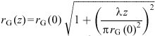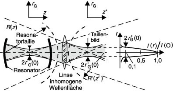 der inhomogenen Wellenflächen, zu denen die gekrümmten, nicht der geometrischen Optik gehorchenden Lichtstrahlen orthogonal sind, mit dem Abstand z von der als Taille bezeichneten engsten Bündeleinschnürung ![]()