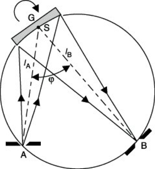 Auf einer Gitterdrehung bei festem A und B (Abb. 3) beruht die konstruktiv einfache Seya-Namioka-Aufstellung (M. Seya 1952, T. Namioka 1954), die aus der Forderung abgeleitet wird, daß die Defokussierung (konrrigierte Konkavgitter) in dritter Ordnung des Drehwinkels des Gitters um den Scheitel S verschwindet. Es ergibt sich ϕ=2 arcsin(1/ ![]()