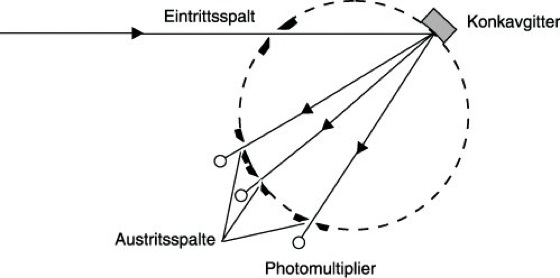 Gitterspektrometer, ein Spektrometer, bei dem die Zerlegung des Lichtes durch ein Beugungsgitter erfolgt. Es unterscheidet sich von einem Gitterspektrographen dadurch, daß anstelle der Photoplatte ein oder mehrere Austrittsspalte mit dahinter angebrachten photoelektrischen Strahlungsempfängern vorhanden sind. G. mit einem Austrittsspalt heißen Gittermonochromatoren, solche mit mehreren Austrittsspalten Gitterpolychromatoren (Abb.). Die durch das Gitter ermöglichte gegenseitige Überdeckung von Linien verschiedener Spektralordnung wird zum Teil durch eine günstige Kombination von Empfänger und optischem Filter hinter dem Austrittsspalt beseitigt.
