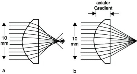 1) Axialer Gradient. Der Brechungsindex variiert in Richtung der optischen Achse. Es konnte (zunächst rechnerisch) gezeigt werden, daß eine asphärische Linse einer sphärischen Linse mit einem geeigneten axialen Gradienten gleichwertig ist. Die Abb. macht an einem durchgerechneten Beispiel deutlich, wie die große sphärische Aberration einer Einzellinse aus homogenem Material durch Herstellung eines axialen Gradienten geeigneter Größe beseitigt werden kann.