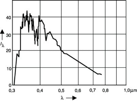 Himmelsstrahlung: Spektrale Intensitätsverteilung Iλ des Zenithimmelslichtes, aufgenommen in Musallah (2925 m), Bulgarien; Sonnenhöhe 26,5° (Iλ in relativen Einheiten).