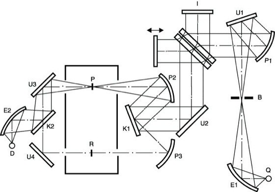 Im Gegensatz zu den klassischen Spektrometern benötigen Fourier-Spektrometer keine dispersiven Elemente wie Prismen und Gitter. Die äußere Optik eines I. besteht ausschließlich aus Spiegeln (Abb. 2). Der elliptische Spiegel E1 bildet die Quelle Q in eine im Durchmesser veränderliche Blende B ab. Die Divergenz der Strahlung kann so im Hinblick auf die angestrebte Auflösung passend gewählt werden. Nach Umlenken durch den Planspiegel U1 kollimiert ein Parabolspiegel P1 die Infrarotstrahlung aus der Blendenposition in das vom Interferometer I benötigte Parallelbündel. Die aus dem Interferometer austretende modulierte Strahlung wird mit den Parabolspiegeln P2, P3 in die Probenpositionen P bzw. R zwischenfokussiert und mit dem elliptischen Spiegel E2 auf die Detektorfläche D abgebildet. Die Planspiegel U3 und U4 sowie die schaltbaren Planspiegel K1 und K2 realisieren zwei Strahlengänge. Anstelle absoluter Intensitätsmessungen werden meist Vergleichsmessungen zwischen der Probe P und einer Referenzprobe R (z.B. ein gefüllter und ein leerer Probenbehälter) durchgeführt. Die spektrale Absorption der Probe ist dann der Quotient beider Spektren und so unabhängig von der spektralen Empfindlichkeit des Spektrometers.