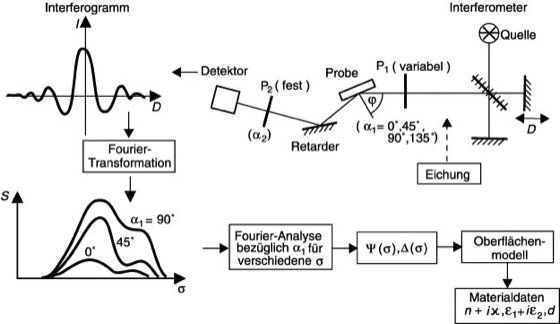 104/m. Aufgrund der Intensitätsprobleme in diesem Gebiet werden für das Arbeiten bei festen Wellenzahlen Laser als Lichtquellen oder für die spektroskopische I. eine Kopplung des Infrarot-Fourier-Spektrometers mit dem photometrischen Ellipsometer verwendet. Abb. 1 zeigt das Prinzip der letztgenannten Anordnung mit einem Retarder im Strahlengang (für die Messung aller vier Stokes-Parameter erforderlich). Von der Quelle gelangt die Strahlung über das Fourier-Spektrometer und das photometrische Ellipsometer zum Detektor. Dabei nutzt man den hohen Lichtleitwert und den Multiplexvorteil des Interferometers (Fourier-Spektroskopie). Es werden Spektren in unterschiedlichen Winkelstellungen des Polarisators gemessen (mindestens vier Positionen, z.B. α1=0°, 45°, 90°, 135°). Während der Messung darf der Polarisator nicht verändert werden. Die polarisierende Wirkung des Fourier-Spektrometers selbst wird durch Eichmessungen berücksichtigt. Aus den Spektren werden durch Fourier-Analyse bezüglich α1 die Stokes-Parameter berechnet (Ellipsometer) und anschließend die optischen Konstanten ermittelt. Eine andere Variante der I. besteht darin, daß man einen zeitabhängigen Retarder in Gestalt eines photoelastischen Modulators verwendet. Der zugrunde liegende physikalische Mechanismus ist dabei der folgende: Eine angelegte elektrische Spannung führt vermöge Elektrostriktion zum Auftreten einer mechanischen Spannung, die wiederum optische Doppelbrechung hervorruft (Spannungsdoppelbrechung). Ist die elektrische Spannung eine Wechselspannung der (Kreis-)Frequenz Ω, so erhält man einen Retarder, der einen periodisch sich ändernden Gangunterschied δ=δmaxsinΩt (t Zeit) erzeugt. Als Material wird die Substanz ZnSe verwendet, die im Wellenzahlbereich von 70000 bis 400000 m-1 durchlässig ist. Die gemessene Intensität zeigt die gleiche Periodizität wie δ und kann daher in eine Fourier-Reihe entwickelt werden. Aus den mit Ω und 2Ω oszillierenden Anteilen können die elliptischen Parameter Δ und Ψ der Strahlung bestimmt werden.