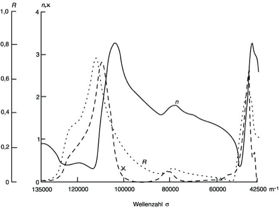 Infrarotellipsometrie 2: Ellipsometrisch bestimmte Werte des Brechungsindexes n, des Reflexionsvermögens R und der spektralen Absorptionszahl Κ für SiO2 (Einfallswinkel ϕ=70°, spektrale Auflösung δσ=800/m).