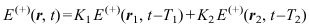 zusammen. Dabei bezeichnen K1 und K2 von der Lochgröße und vom Abstande |r-r1|bzw.|r-r2| abhängige Faktoren, die berücksichtigen, daß zwischen Primär- und Sekundärwelle jeweils ein Phasensprung von π auftritt. Sie sind daher rein imaginär. Unter T1 und T2 sind die Laufzeiten des Lichtes von der jeweiligen Öffnung zum Beobachtungsort zu verstehen. Sie sind gegeben durch T1=|r-r1|/c und T2=|r-r2|/c, wobei c die Lichtgeschwindigkeit bezeichnet, und somit allein durch die Geometrie bestimmt.