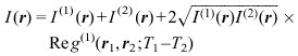 Auf der rechten Seite von (4) und (5) haben die ersten beiden Summanden die Bedeutung der Intensitäten I(1)(r) bzw. I2(r) der beiden Teilwellen am Orte r (sie sind einzeln so zu messen, daß man jeweils eine der beiden Öffnungen abdeckt), während der dritte Summand für die Interferenzerscheinungen verantwortlich ist und daher Interferenzterm genannt wird. Es ist zweckmäßig, (5) folgendermaßen umzuschreiben
