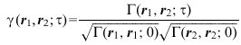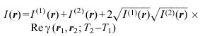 Der Interferenzterm wird also wesentlich durch die Funktion γ(r1,r2;τ) – mit τ=T2-T1 als dem durch c dividierten Gangunterschied Δs=|r-r2|-|r-r1| der beiden interferierenden Teilwellen am Orte r – bestimmt. γ(r1,r2;τ) wird deshalb komplexer Kohärenzgrad der um τ gegeneinander verzögerten Lichtschwingungen an den Orten r1 und r2 genannt, während die unnormierte Funktion Γ(r1,r2;τ) wechselseitige Kohärenzfunktion heißt.