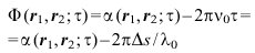 Zerlegt man γ(r1,r2;τ) in seinen Betrag und einen Phasenfaktor exp(iΦ(r1,r2;τ), so lautet der Interferenzterm 2|γ(r1,r2;τ)|cosΦ(r1,r2;τ). Im Gegensatz zu |γ(r1,r2;τ)| hängt die Phase Φ(r1,r2;τ) sehr stark von τ ab. Da sie sich bei Verschiebung des Beobachtungspunktes auf dem Beobachtungsschirme in sehr guter Näherung linear mit der Koordinate z in Abb. 1 ändert (s.u.), beschreibt der Kosinusfaktor das zu beobachtende System der Interferenzstreifen. Die Phase Φ(r1,r2;τ) kann in der Form![]()