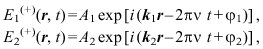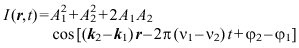 I. zwischen unabhängigen Lichtwellen. Solche Experimente sind mit Laserlicht durchführbar. Laserwellen können während der Kohärenzzeit als laufende ebene Wellen mit scharfer Amplitude A und Phase ϕ angesehen werden. Überlagert man von zwei unabhängigen Lasern emittierte Wellen mit den elektrischen Feldstärken![]()