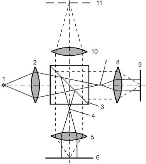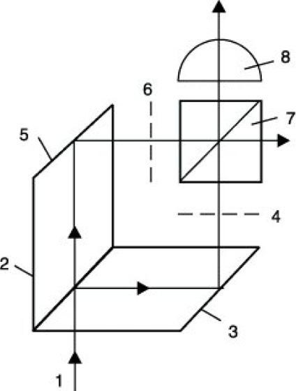 Interferenzmikroskop 1: Durchlichtinterferenzmikroskop nach Krug und Lau. 1 einfallender Strahl, 2 erste Teilungsfläche, 3 und 5 reflektierende Prismenflächen, 4 Objektebene, 6 zu 4 konjugierte Ebene, 7 zweite Teilungsfläche, 8 Objektiv.