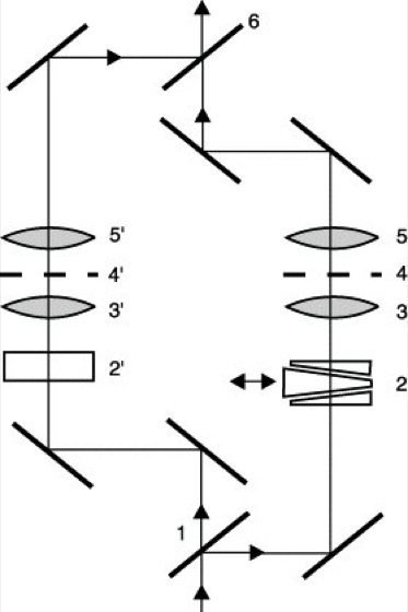 Interferenzmikroskop 2: Optisches Schema des Interferenzmikroskopes nach Horn. 1 erste Teilungsfläche, 2 und 2' Kompensationskeil und Kompensationsplatte, 3 und 3' Kondensor, 4 und 4' Objekt und Vergleichsobjekt, 5 und 5' Objektiv, 6 zweite Teilungsfläche.