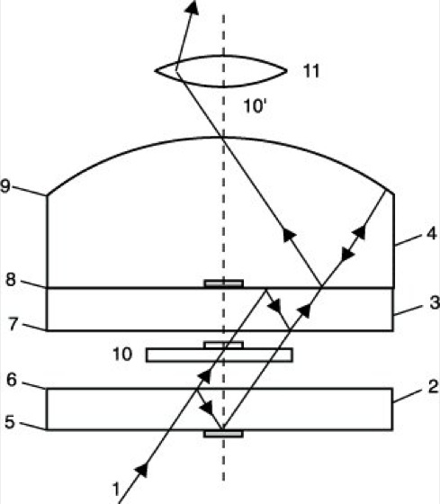 Von Dyson wurde eine Anordnung vorgeschlagen, die einem normalen Mikroskopobjektiv vorgeschaltet wird (Abb. 3). Sie arbeitet nach dem Prinzip eines Jamin-Interferometers mit rotationssymmetrischer Beleuchtung. Es erfolgt eine Aufspaltung und teilweise Wiedervereinigung der Strahlen durch innere Reflexion an zwei schwach keilförmigen Glasplatten 2 und 3 mit ebenen Oberflächen. Mit der Platte 3 verkittet ist der Spiegelkörper 4, dessen Kugelfläche 9 bis auf einen kleinen zentralen Fleck voll verspiegelt ist. Die Flächen 6, 7 und 8 sind halbdurchlässig und der zentrale Teil der Fläche 5 ist undurchlässig verspiegelt. Der einfallende Strahl 1 wird an der Fläche 6 in zwei Teilstrahlen aufgespalten, die nach Reflexion an den Flächen 8 bzw. 5 und Durchlaufen gleicher optischer Wege an der Fläche 7 wieder vereinigt werden. Der Kugelspiegel vermittelt eine gleichzeitige Abbildung der Objektebene 10 und der Vergleichsfläche 5 im Maßstab 1:1 in die Objektebene 10' des Objektivs 11, so daß in dieser Ebene ein Interferenzbild des in der Objektebene 10 befindlichen Phasenobjektes entsteht. Eine Zentralblende auf der Fläche 8 sorgt dafür, daß nur am Spiegel 9 reflektiertes Licht nach 10' gelangt. Der Nachteil des Verfahrens von Dyson besteht in der Beschränkung des Sehfeldes wegen des bei der Abbildung durch eine Kugelfläche unvermeidlichen außeraxialen Astigmatismus, weiterhin im Auftreten von zusätzlichem Streulicht und in der etwas schwierigen Handhabung, weil das Präparat stets beiderseitig im Immersionsöl eingebettet werden muß.