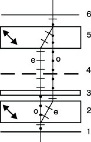 Interferenzmikroskop 4: Polarisationsinterferometer nach Jamin-Lebedeff. 1 Polarisator, 2 und 5 gleiche Kalkspat- oder Quarzplatten, 3 λ/2-Platte, 4 Objektebene, 6 Analysator, o ordentlicher und e außerordentlicher Strahl.
