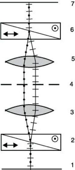 Interferenzmikroskop 5: Optisches Schema des Interferenzmikroskopes nach Smith. 1 Polarisator, 2 und 6 Wollaston-Prismen, 3 Kondensor, 4 Objektebene, 5 Objektiv, 7 Analysator.