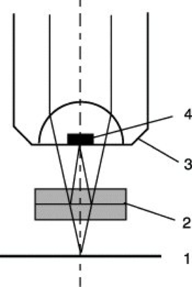 Eine andere einfache Auflichtanordnung ist von Mirau vorgeschlagen worden (Abb. 7). In der Mitte zwischen der Objektebene 1 und der Objektivfrontlinse befindet sich zwischen zwei verkitteten Glasplättchen die Teilungsfläche 2, an der die Strahlen aufgespalten und nach Reflexion an der Präparatoberfläche 1 bzw. dem verspiegelten Fleck 4 der Objektivfrontlinse wieder vereinigt werden. Der Abstand der Interferenzstreifen kann durch Neigen von 1,2 oder 4 variiert werden.