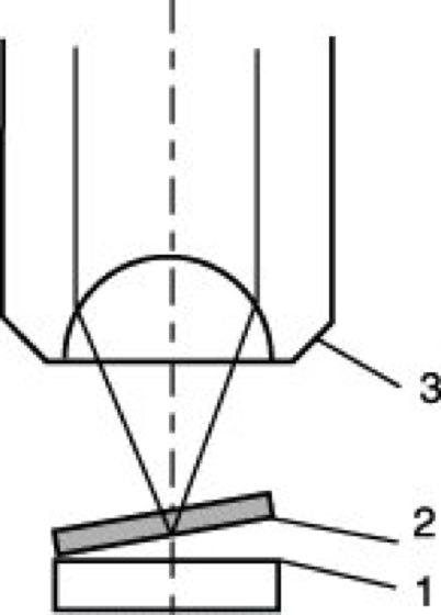 Schließlich haben die Interferenzen am reellen Keil eine sehr breite Anwendung in der Interferenzmikroskopie gefunden, besonders in der Form der Vielstrahlinterferenz. Man legt nach Abb. 8 eine halbdurchlässig verspiegelte Glasplatte 2 mit der verspiegelten Seite so auf eine gut reflektierende Oberfläche 1, daß zwischen beiden ein kleiner Keil entsteht und erkennt mit einem Mikroobjektiv 3 im Bereich dieses Keils eine Anzahl Interferenzstreifen. Diese sind um so schärfer, je kleiner der Abstand zwischen Objektebene und Vergleichsfläche, je kleiner die Beleuchtungsapertur, je besser die Monochromasie des verwendeten Lichtes und je höher das Reflexionsvermögen von Präparatoberfläche und Vergleichsfläche sind. Alle Unregelmäßigkeiten auf beiden Flächen werden sehr empfindlich durch Auslenkung der Interferenzstreifen angezeigt.