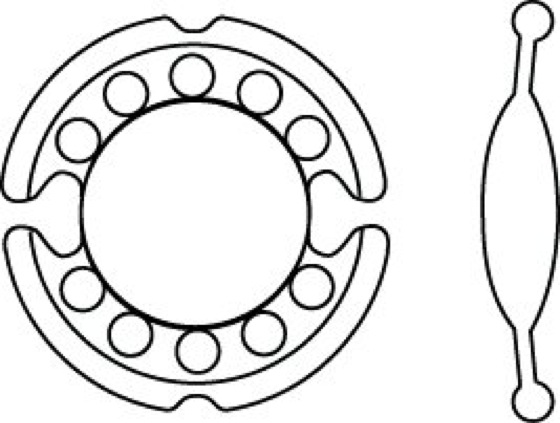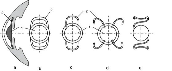 a) Vorderkammerlinsen (Abb. 1 und 2) werden im vorderen Kammerwinkel fixiert. Sie bestehen entweder aus einem Stück oder aus dem Optikteil und dem elastischen Halteapparat, der vielfältig ausgebildet sein kann (Abb. 1a bis e).