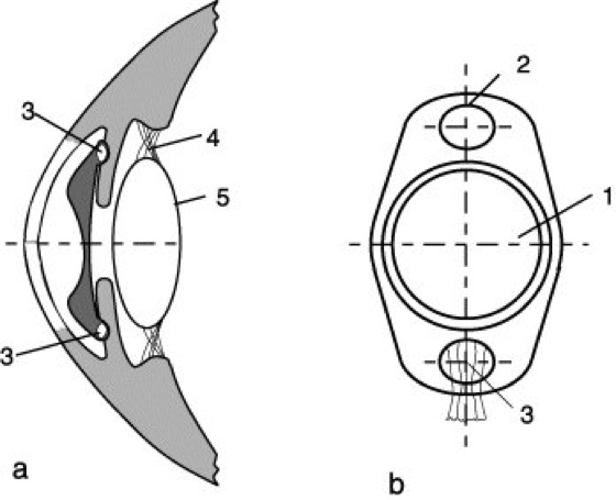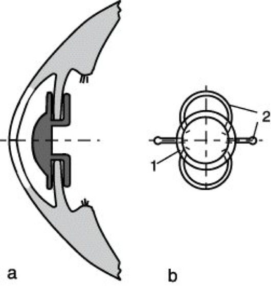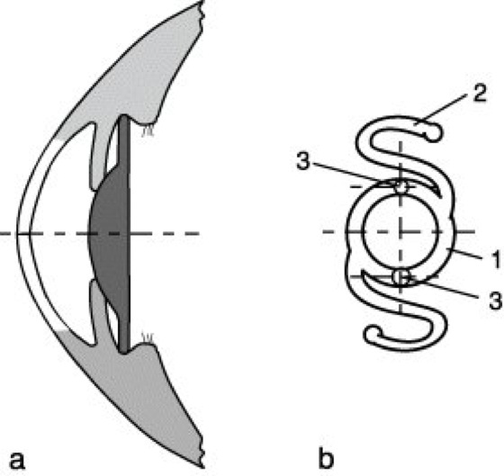Intraokulare Linse 4: Hinterkammerlinse. a) Fixierung im Hinterkammerwinkel (Sulcus), b) Bügellinse. 1 Optik aus PMMA, 2 Haltebügel aus PMMA oder Silicon, 3 Bohrungen für Spezialpinzette zum Durchführen durch die Pupillenöffnung bei der Implantation.