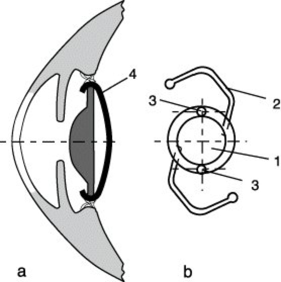 Intraokulare Linse 5: Hinterkammerlinse. a) Fixierung im Kapselsack, b) Bügellinse. 1 Optik aus PMMA, 2 Haltebügel aus PP, 3 Bohrungen für Spezialpinzette, 4 Hinterkapsel der Augenlinse.